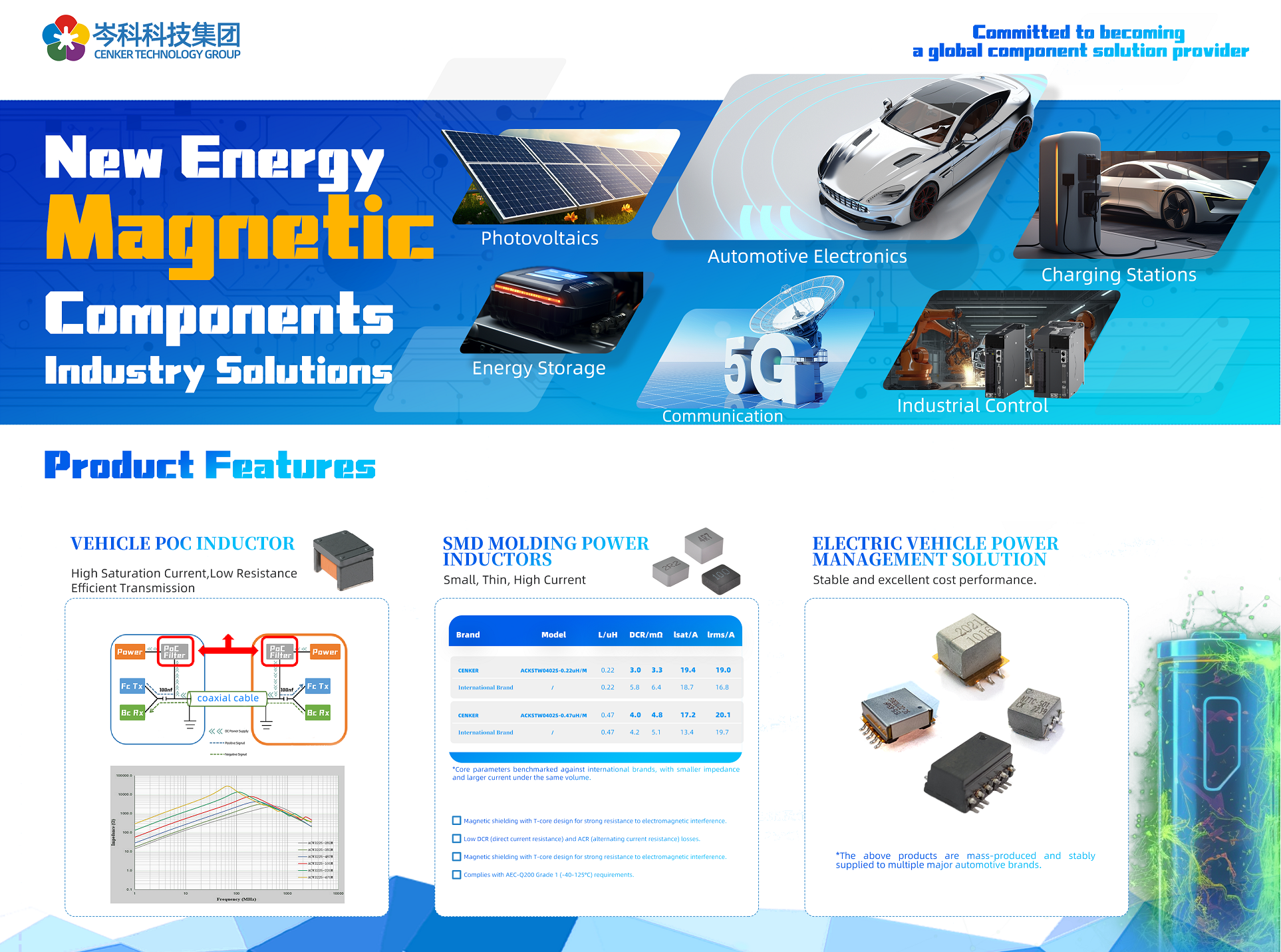 岑科科技作為行業技術領先的電感元件制造商,一直致力于向客戶提供高品質、高性能的產品及專業技術服務。在本次展會中,我們特別展出了針對汽車電子和新能源領域的創新產品解決方案,詳細介紹各個模塊的應用環境及特點,為客戶提供精準的產品選型指導。